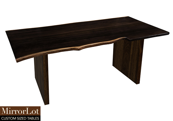 This dark espresso stained table brings rustic charm to any room in your house. It is rectangular with a bronze live edge, but can be customized to your desired shape and size. The live edge shape table top is made from solid poplar wood and the table legs are