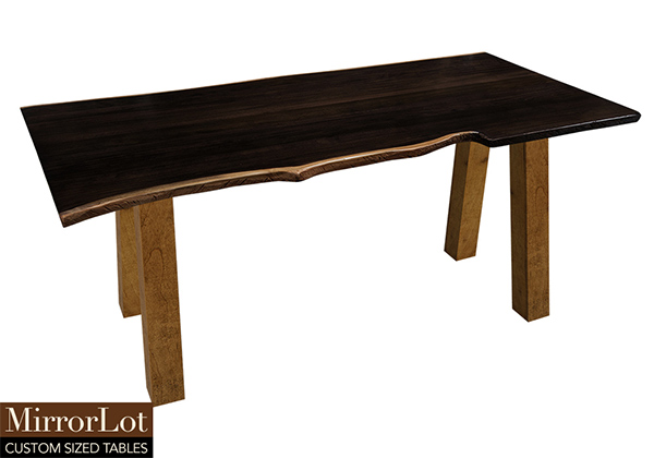 This dark espresso stained table brings rustic charm to any room in your house. It is rectangular with a bronze live edge, but can be customized to your desired shape and size. The live edge shape table top is made from solid poplar wood and the table legs are
