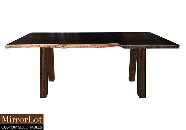 This dark espresso stained table brings rustic charm to any room in your house. It is rectangular with a bronze live edge, but can be customized to your desired shape and size. The live edge shape table top is made from solid poplar wood and the table legs are