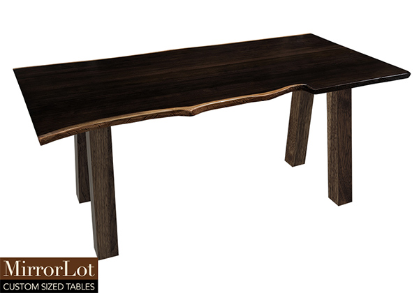 This dark espresso stained table brings rustic charm to any room in your house. It is rectangular with a bronze live edge, but can be customized to your desired shape and size. The live edge shape table top is made from solid poplar wood and the table legs are