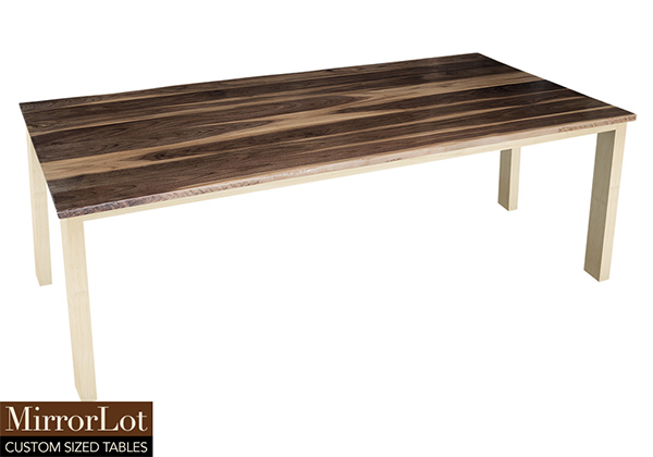 This natural walnut table brings rustic charm to any room in your house. It is rectangular with a live edge, but can be customized to your desired shape and size. The live edge shape table top is made from solid walnut wood and the table legs are