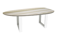 $5609 for 110x61 inch Table. This Monterey table has a round shape tabletop with white finish and natural spanish cedar table legs and can be use as boat-shaped table, custom built solid wood table, and more. As routines develop, its scale allows multiple seating arrangements without compromising comfort or accessibility. This table feels intentional noticeably without being visually demanding.
