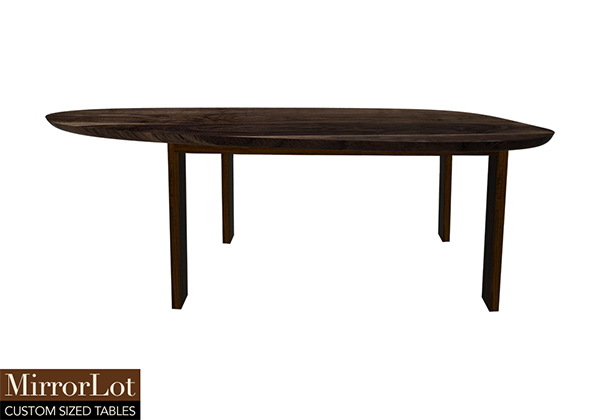 $7579 for 116x66 inch Table. This Plano table has a beveled knife edge unique round shape tabletop with natural american walnut finish and bronze walnut stained table legs and can be use as solid wood table with custom size, meeting table, and more. The 116 inch table feels reliable as well as enduring, built to withstand repeated use in demanding environments. In everyday use, rather than feeling oversized or undersized, the table strikes a comfortable middle ground.
