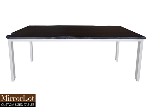 $2599 for 123x19 inch Table. This Mission table has a live edge shape tabletop with espresso stained with darker edge finish and white table legs and can be use as custom wood table, made to order wood table, and more. The tactile experience of the wood invites touch while also interaction while communicating quality. The 123 inch table anchors expansive spaces with a sense of intention while also sophistication as part of daily life.