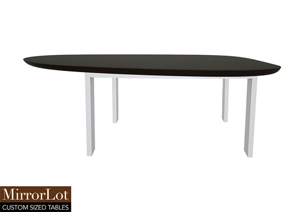 $7599 for 136x61 inch Table. This Kingston table has a beveled knife edge unique round shape tabletop with dark Kona brown/espresso stained finish and white table legs and can be use as executive desk, display table, and more. For many people, the wood feels weighty while also solid, giving the table authority and permanence in any space without drawing attention. This 136 inch table tends to feel like it belongs, regardless of the room it’s placed in. The table balances grand presence comfortably with practical usability, allowing long meals or extended work sessions.