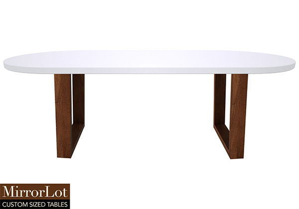 $7449 for 139x57 inch Table. This Cupertino table has a oval shape tabletop with white finish and natural african mahogany table legs and can be use as solid wood dining table, bistro table, and more. The wood surface communicates quality and permanence, enriching intentionally the overall room atmosphere. In active households, its presence establishes the tone for the room, offering authority, warmth, and function. Built to support real activities, this table feels more permanent than lightweight alternatives.