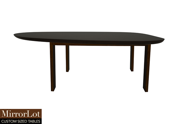 $2289 for 56x45 inch Table. This Kingston table has a beveled knife edge unique round shape tabletop with dark Kona brown/espresso stained finish and bronze walnut stained table legs and can be use as end table, work desk, and more. This table feels intentional without being visually demanding without complication. The 56 inch table feels grounded which helps create a intentionally calm atmosphere in the room.
