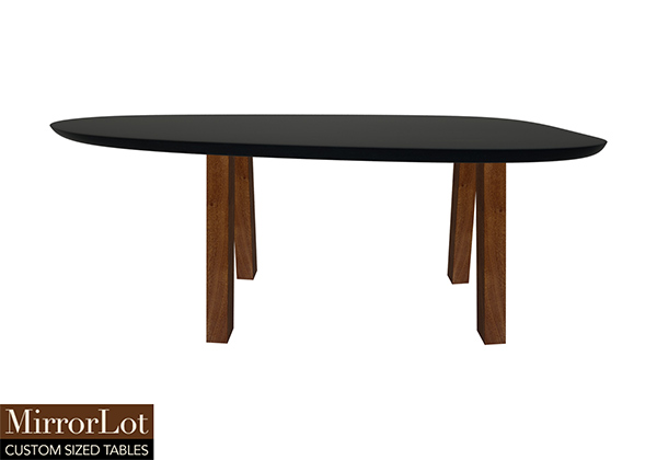 $1889 for 86x23 inch Table. This Vail table has a beveled knife edge unique round shape tabletop with black stained finish and natural african mahogany table legs and can be use as side table, dining & eating tables, and more. Rather than dominating the room, this 86 inch table settles in comfortably along with confidently as needs change. The table balances durability and aesthetic, ensuring it can handle frequent use while remaining visually appealing without drawing attention. As needs evolve, the surface invites touch and use, offering a tactile satisfaction that complements its visual appeal without drawing attention.