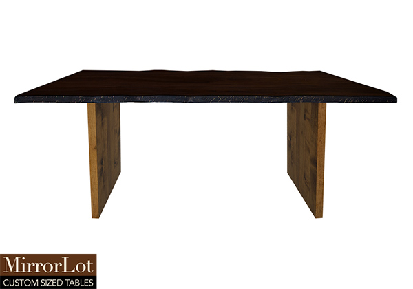 $1789 for 94x18 inch Table. This Beaumont table has a live edge shape tabletop with bronze walnut stained with dark edge finish and dark natural supreme alder table legs and can be use as custom solid wood home table, made to order wood table, and more. The 94 inch table inspires both work while comfortably also social connection through its scale and texture. This table often becomes a piece people rely on without actively thinking about it in a balanced way.