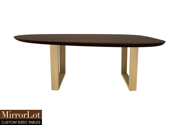 $1989 for 97x18 inch Table. This Somerville table has a beveled knife edge unique round shape tabletop with bronze walnut stained finish and natural supreme alder table legs and can be use as work table, custom size wood table, and more. The table surface maintains integrity as well as beauty under frequent and varied use in a balanced way. Rather than feeling trendy, the 97x18 table carries a timeless quality without effort.