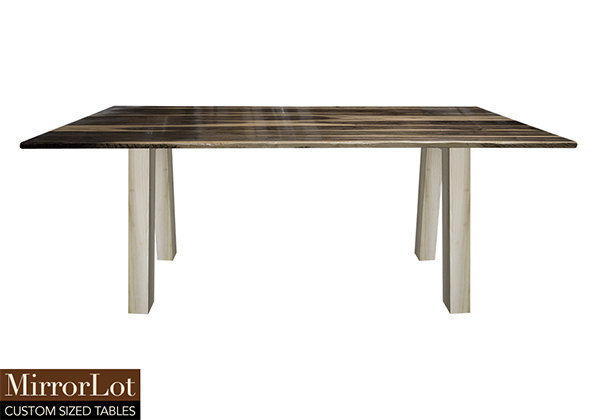 $3129 for 97x31 inch Table. This Pierson table has stripes of natural walnut, mahogany, and poplar finish tabletop and dark kona brown/espresso stained table legs and can be use as breakfast table, low table, and more. The 97 inch table commands attention while remaining harmonious within the room. In lived-in spaces, this table tends to age well within a space as needs change. In spaces that change over time, the table anchors the room visually, creating a central point for conversation, meals, or collaborative projects without drawing attention.